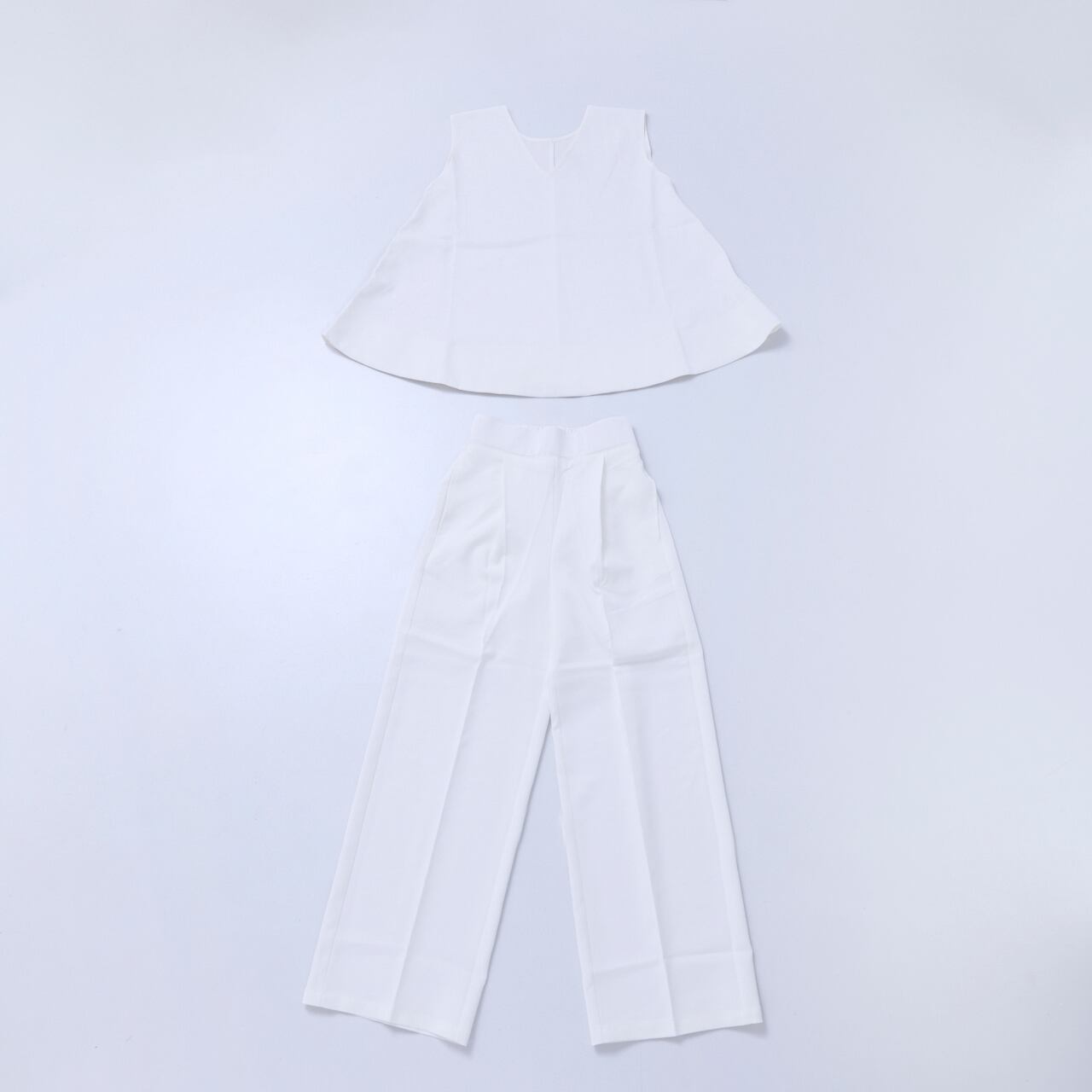 クリーンな印象を与えるトップスとパンツのセットアップ。