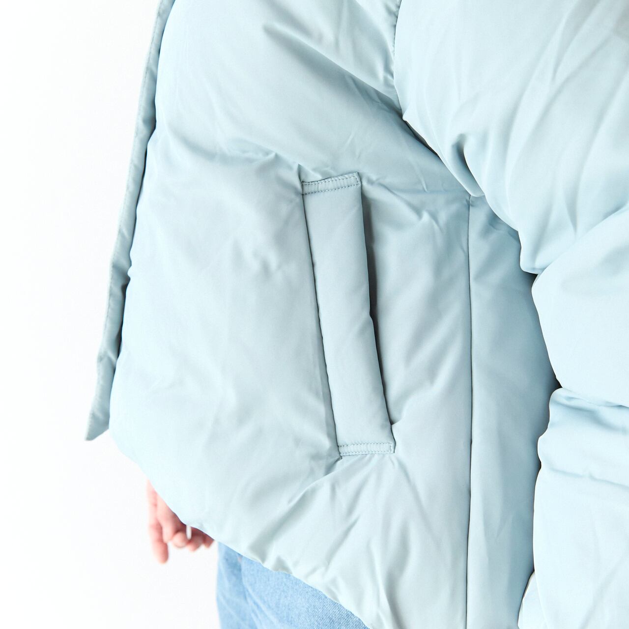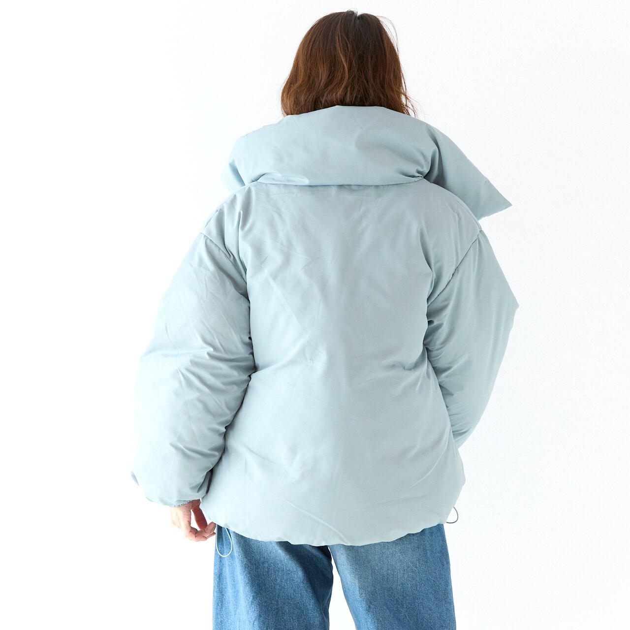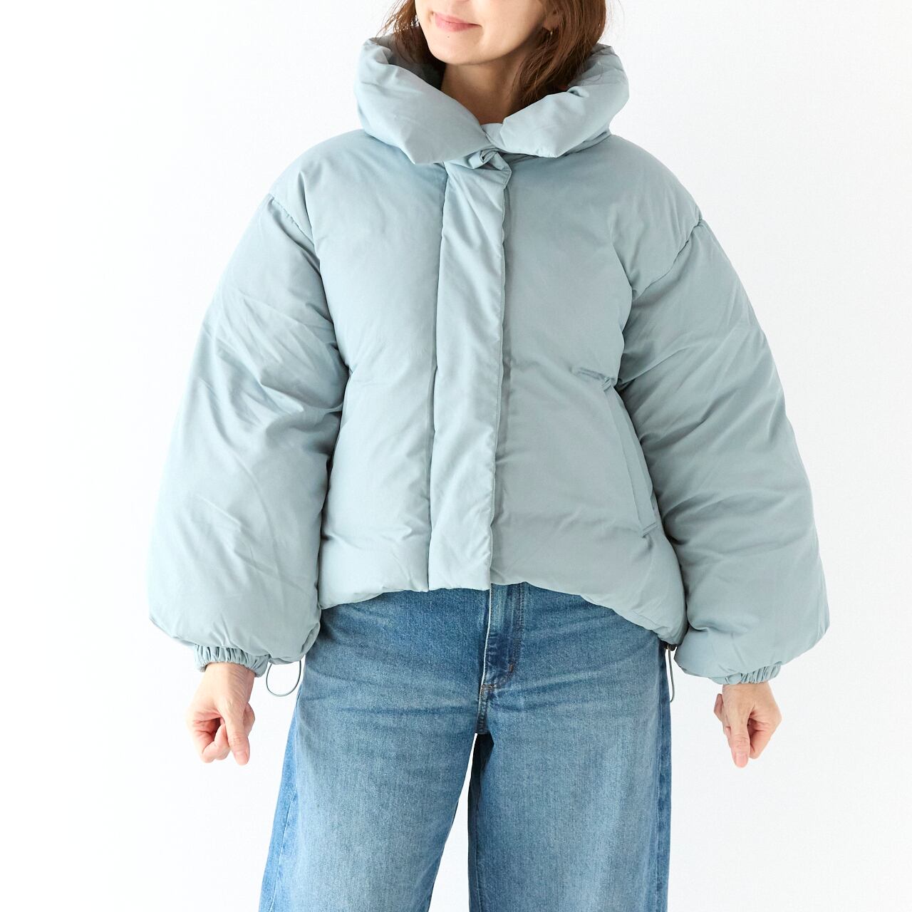 ノンキルトのすっきりとした表面感に、スタンドカラーとボリュームスリーブが映えるデザイン。