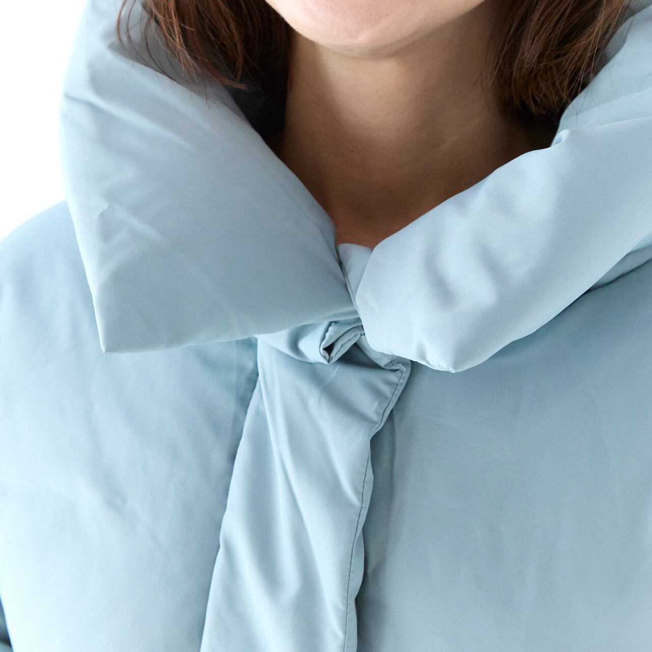 襟元から袖までたっぷりと入れ、首元まであたたかく包み込みます。