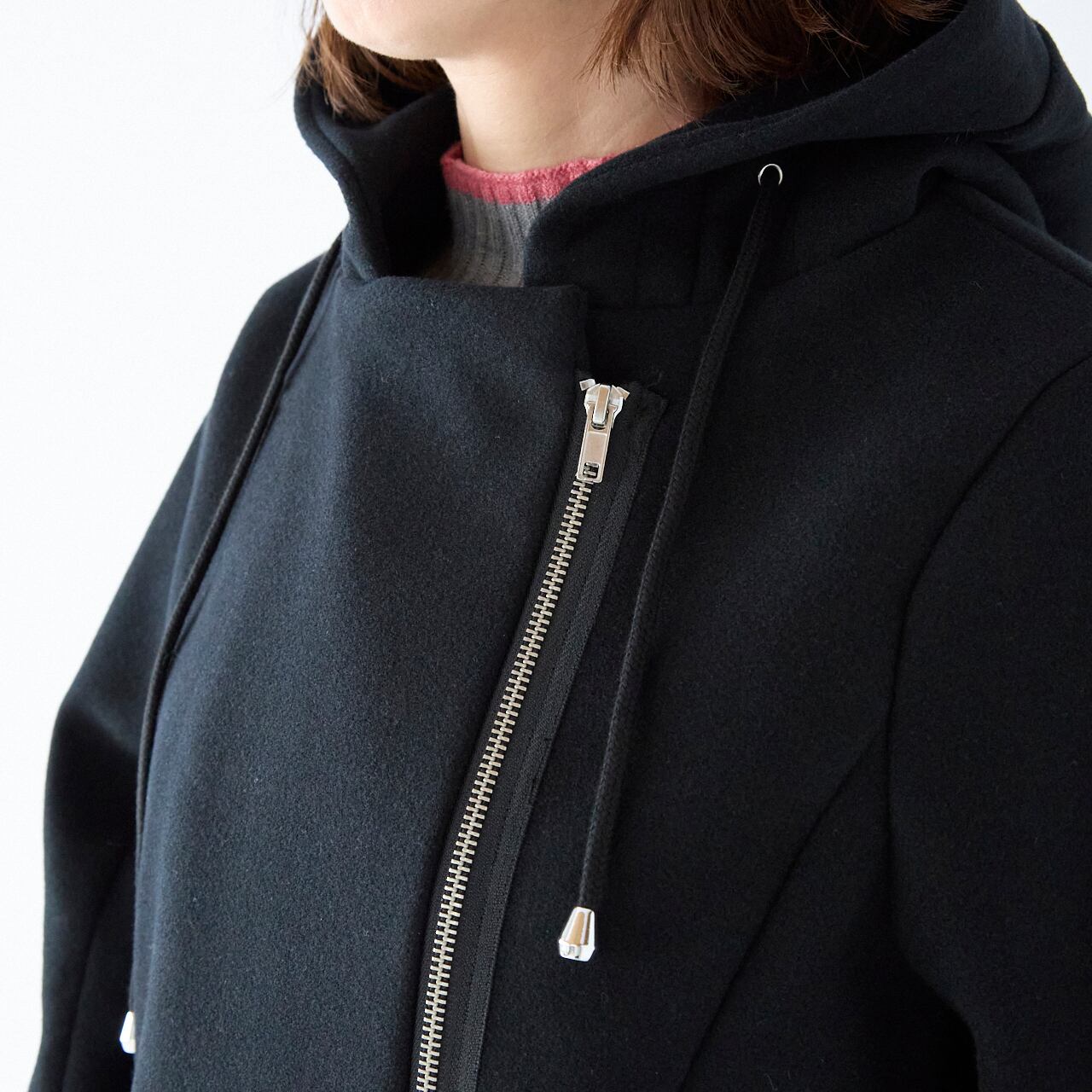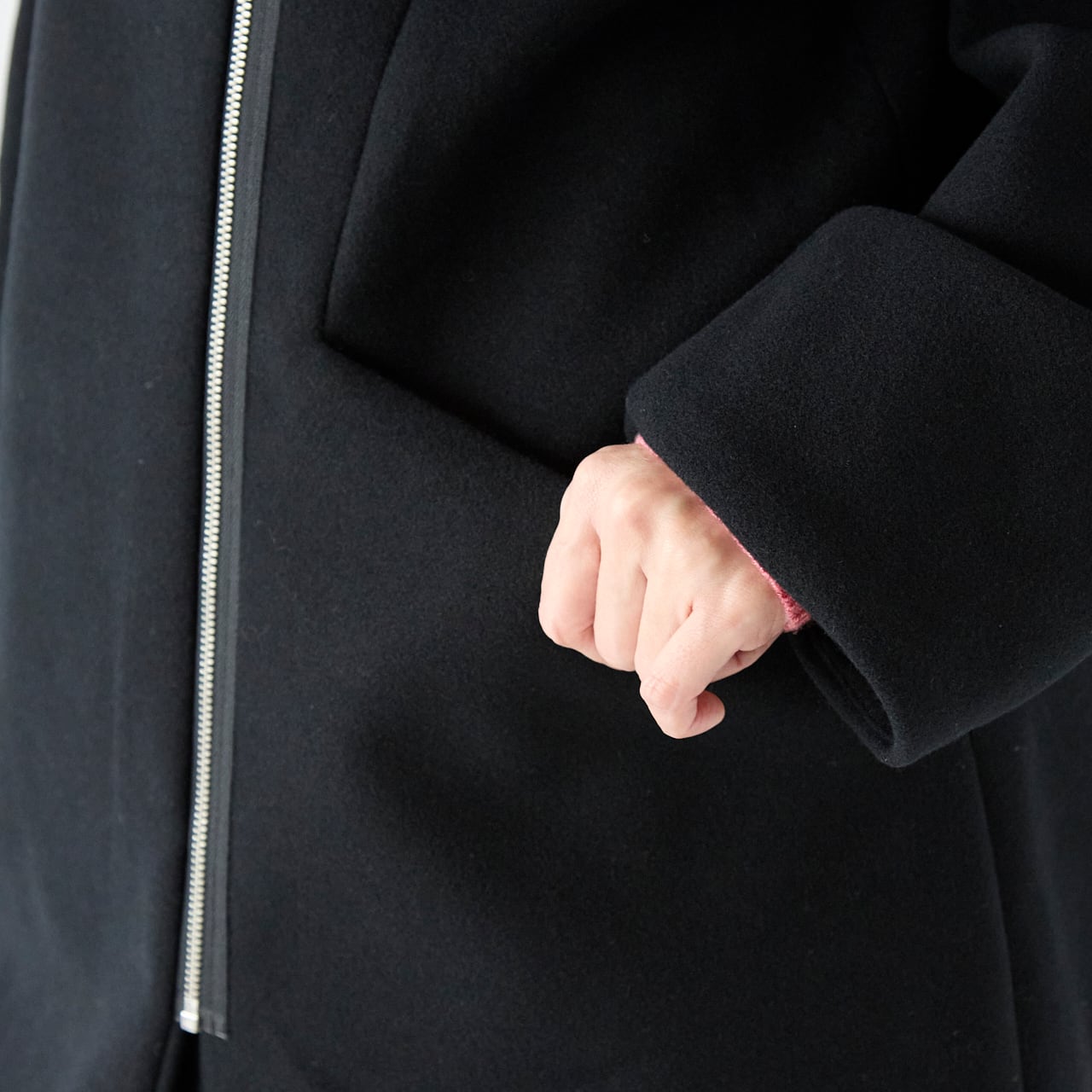 ファスナーを開けて着ると大きい襟のデザインに変化し、スタイリングの幅を広げてくれます。
