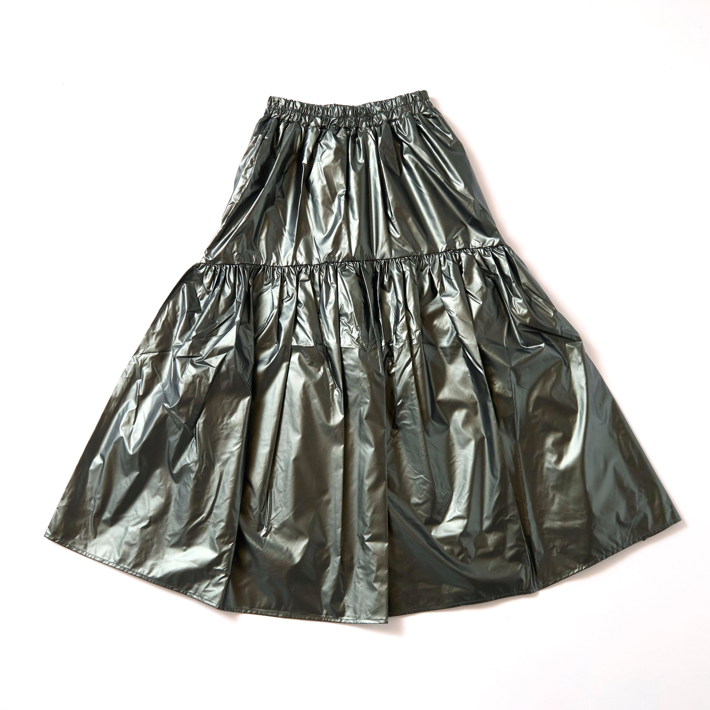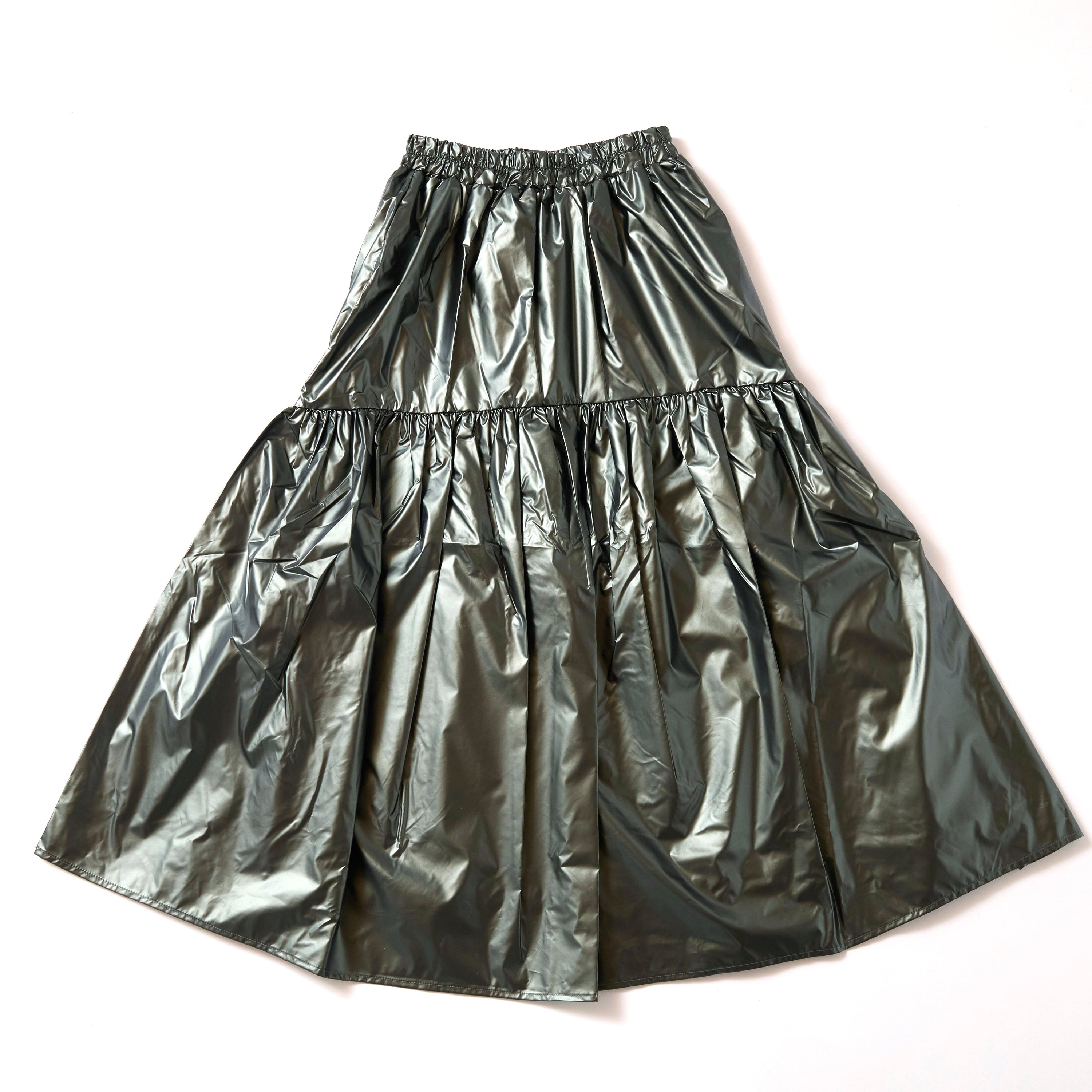 マットメタリックギャザーフレアスカート DARK-KHAKI
