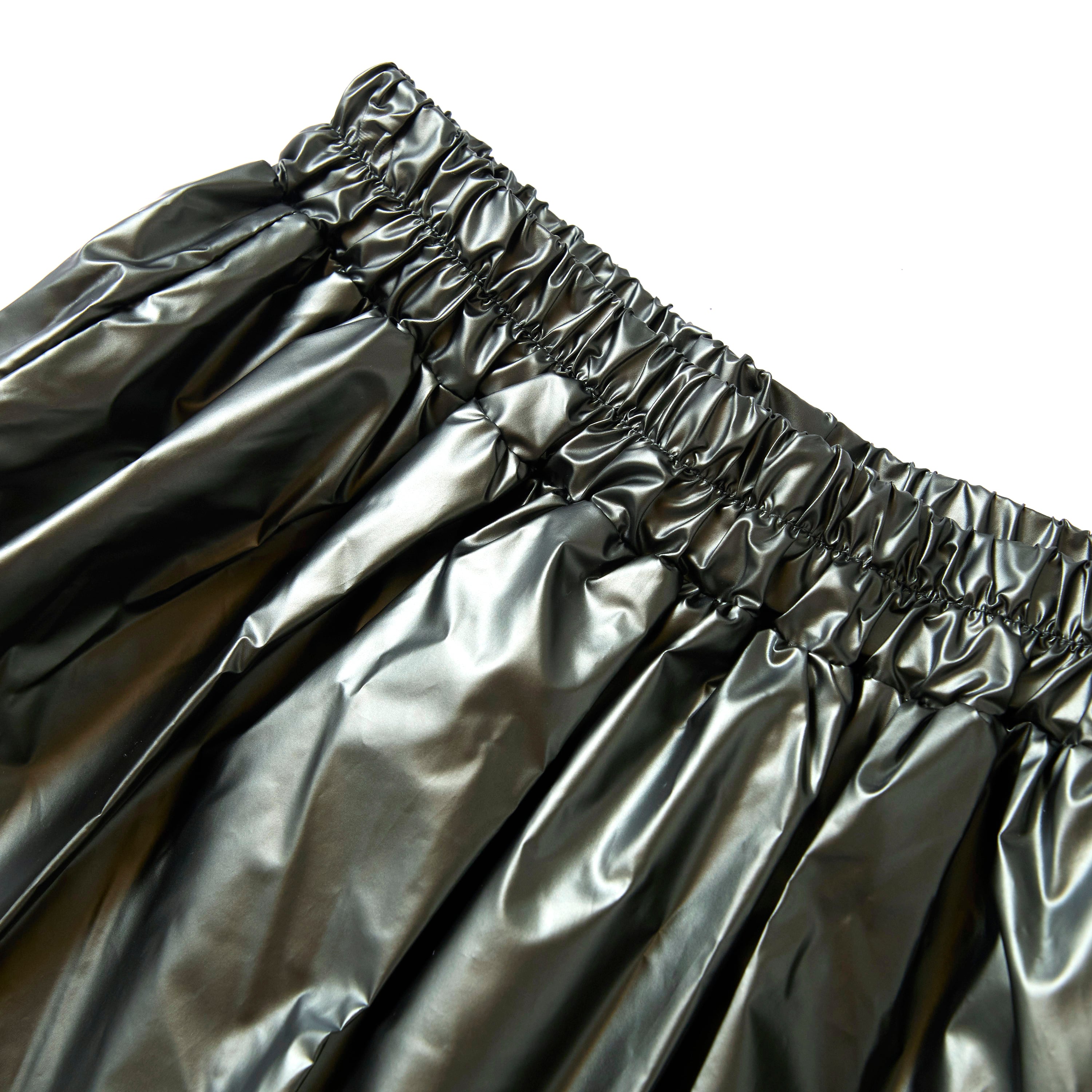 シーズンムードを高めるレザー調の光沢感に、ふわっと広がるギャザーが魅力のスカート。