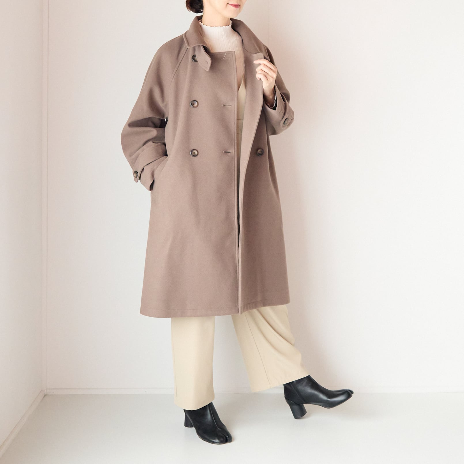 肩まわりをすっきり演出するラグランデザインでスタイリッシュに着られる2WAYカラーコート