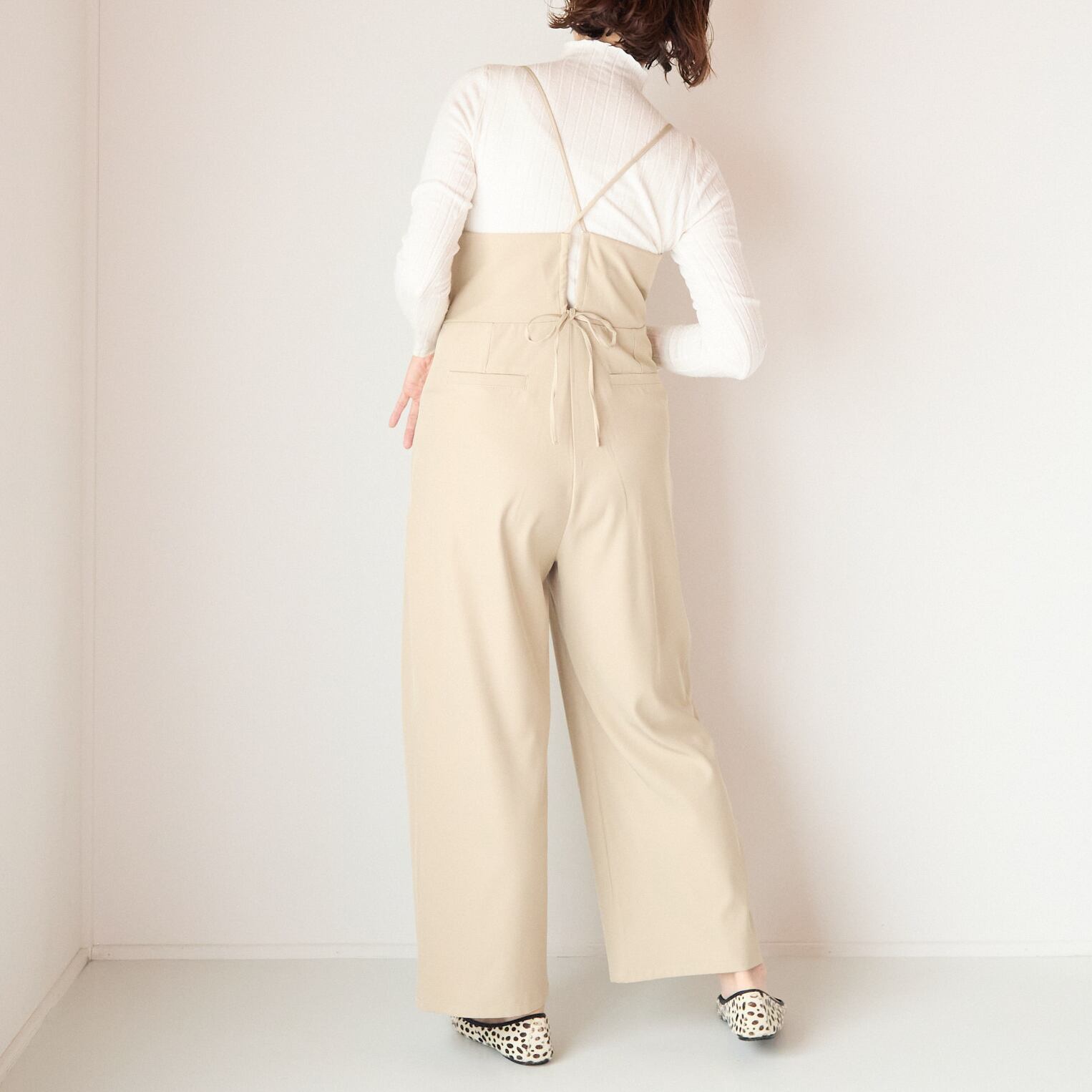 バッククロスの華奢な肩紐に、ドロストカットのディテールも加えたおしゃれなサロペット。