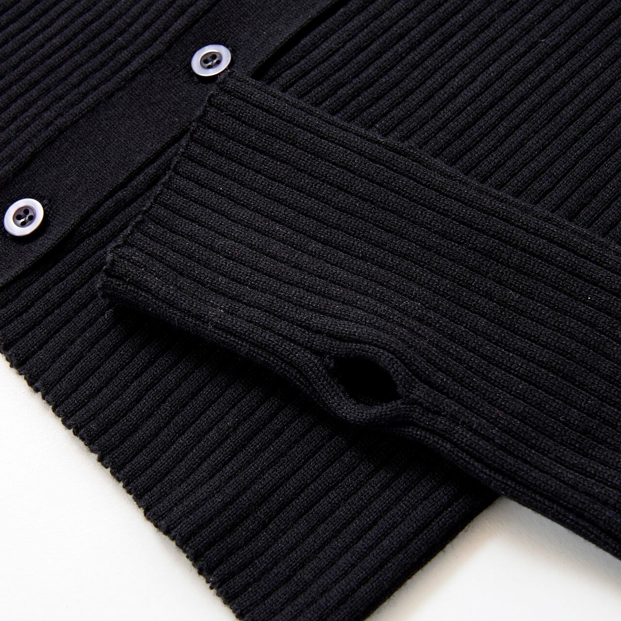 シンプルなクルーネックとさりげないサムホールデザインがポイントのニットカーディガン。